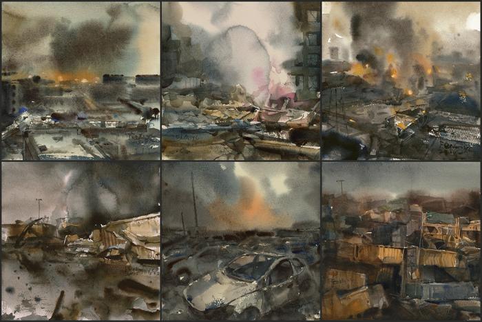 Yuechen Feng Tianjin China Tragedy 20 x 30 inches $1500 |